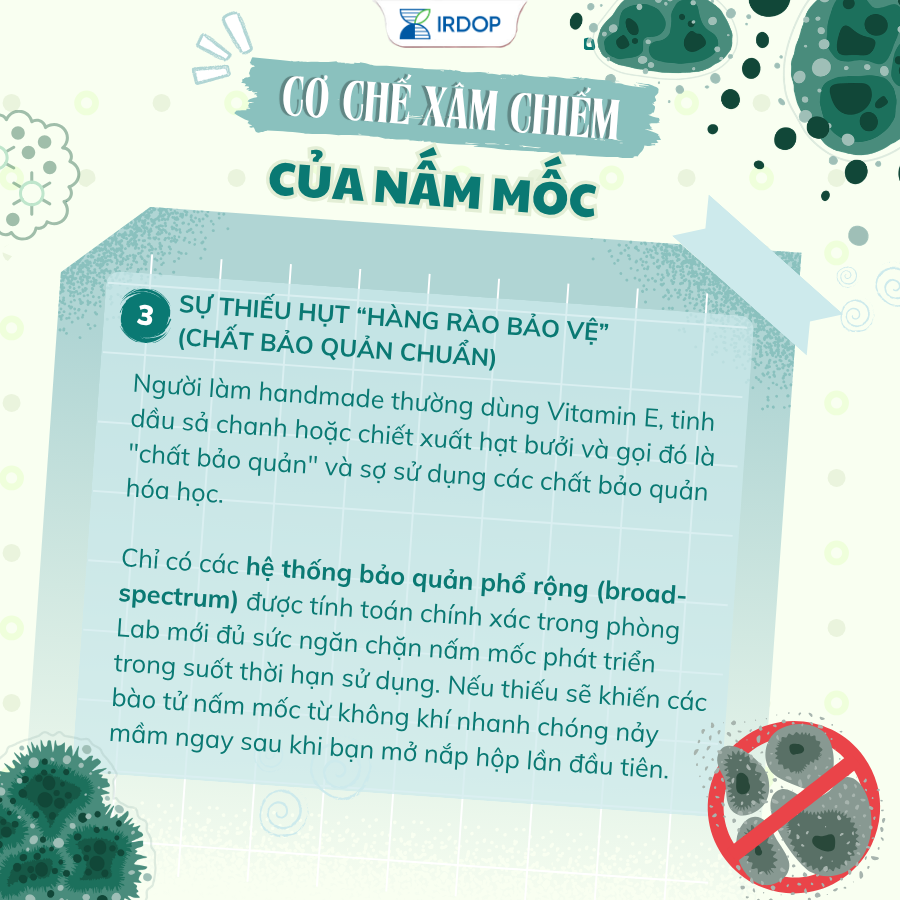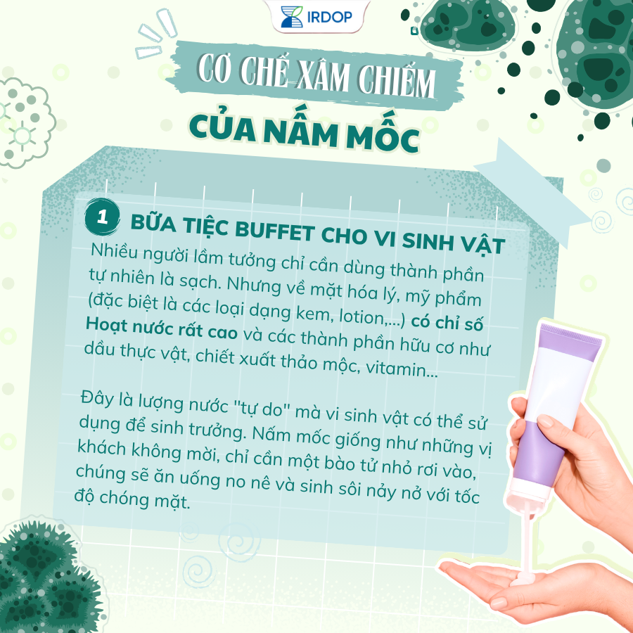 Về mặt hóa lý, các dạng mỹ phẩm nhũ tương (đặc biệt là các loại có kết cấu dạng kem, lotion,…) có chỉ số hoạt độ nước (Aw) rất cao. Đây là lượng nước tự do mà vi sinh vật có thể sử dụng cho quá trình trao đổi chất. Khi kết hợp với các thành phần hữu cơ như dầu thực vật, chiết xuất thảo mộc và vitamin, sản phẩm trở thành một môi trường canh tạng phong phú. Chỉ cần một lượng nhỏ bào tử nấm mốc xâm nhập, chúng sẽ nhanh chóng thiết lập hệ thống sợi nấm (mycelium) và tăng sinh khối theo cấp số nhân