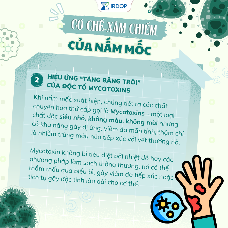 Nhiều người có thói quen gạt bỏ phần mốc nhìn thấy trên bề mặt và tiếp tục sử dụng phần dưới. Đây là một sai lầm chết người. Thực tế, khi vi nấm phát triển, chúng tiết ra các chất chuyển hóa thứ cấp gọi là Mycotoxins [2]. Đây là các hợp chất độc hại có kích thước phân tử siêu nhỏ, không màu, không mùi và có tính bền vững cao. Độc tính của Mycotoxins không bị phá hủy bởi nhiệt độ thông thường và có khả năng thẩm thấu sâu qua lớp sừng, gây viêm da tiếp xúc, dị ứng mãn tính hoặc tích tụ độc tính hệ thống qua thời gian dài. Nếu bạn coi nấm mốc giống như một cái cây, phần bạn nhìn thấy chỉ là “hoa”, còn hệ thống “rễ” (sợi nấm) đã đâm sâu và lan tỏa khắp hũ kem. Phần bạn nhìn thấy được chỉ là cơ quan sinh sản (bào tử), trong khi hệ thống sợi nấm đã lan tỏa và xâm nhiễm toàn bộ thể tích sản phẩm.