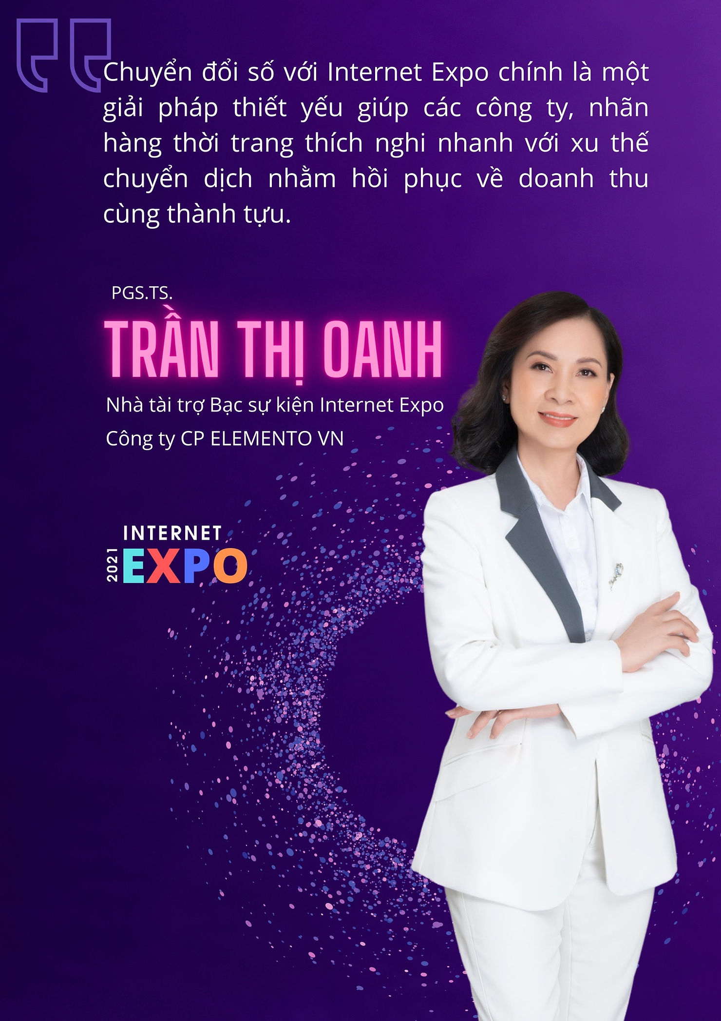 PGS.TS Trần Thị Oanh cảm thấy hân hạnh là Nhà tài trợ Bạc của triển lãm trực tuyến Internet Expo, giúp Elemento chuyển đổi số thành công