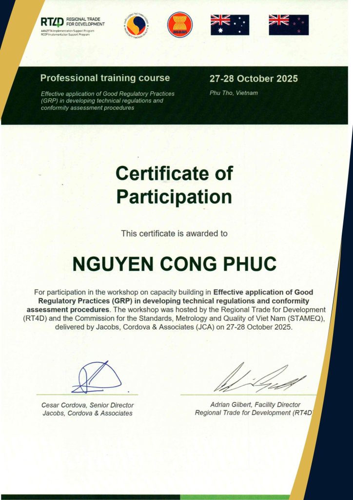 📸 Hình: Chứng chỉ khóa đào tạo “Effective Application of Good Regulatory Practices” được trao cho TS. Nguyễn Công Phúc – IRDOP.